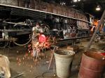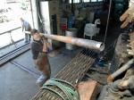 Charlie Harrison hands a flue up to the smokebox. Photo by Dale Birkholz