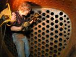 Jim guides one of the last flues into the firebox flue sheet.