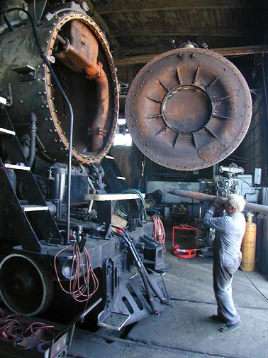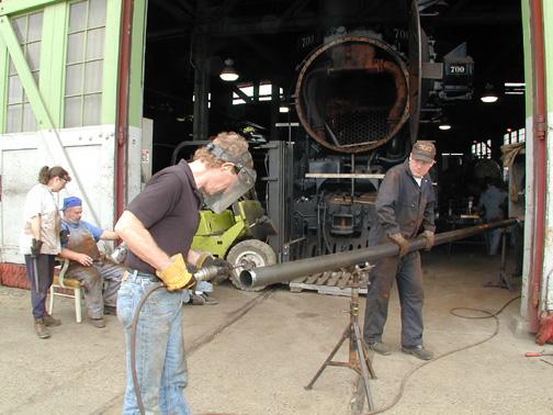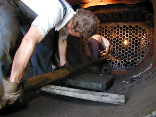 Charlie Harrison hands a flue up to the smokebox. Photo by Dale Birkholz