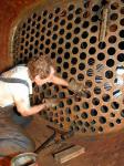 Jim guides one of the last flues into the firebox flue sheet.